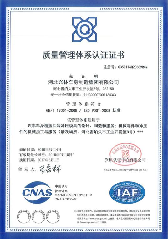 2017年3月1日,我們順利獲得了ISO9001:2008質量管理體系認證書的擴大范圍認證,此次認證順利通過標志著公司在新產品的質量管理方面已經取得較為顯著的成績。質量管理體系認證范圍的擴展預示著興林集團對產品質量、管理水平、企業文化、市場信譽等方面的工作提供有效的保障,也為公司資質申請及升級奠定基礎,對提高企業的經濟效益具有重要的意義。